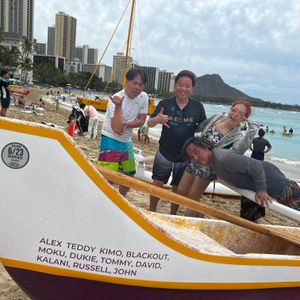 I chose this experience to create lasting memories for my friend's first trip to Hawaii. Two guides accompanied us, and the three of us—my friend and my husband—got into a five-person canoe. The location was the beach in front of the Royal Hawaiian Hotel.
