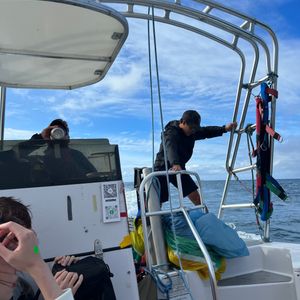 大きな波が何度かきて船の前方が海面に叩きつけることがあり、一緒に乗船していた男性は手すりの持ち方が悪かったせいか肩を脱臼してしまい、あえなく断念。。