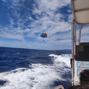 This was my second time parasailing in Hawaii. This time, the wind was strong, and the boat was quite rocky. I think most of the other participants were newlyweds, but one of them got seasick and vomited. I also have a tendency to get motion sickness, so I took some anti-nausea medication before participating, and I didn't feel seasick at all. Anti-nausea medication is a must!