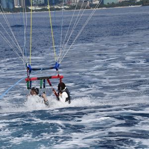 It's a place you can easily reach on foot from the hotel, so I decided to go. The staff on the boat were very pleasant, and I thought they were skilled at operating the vessel. I chose the 150m parasailing option, and there was absolutely no fear; it was exhilarating, the view was amazing, and I even saw whales. I highly recommend this option. I had someone on the boat take photos with my smartphone, so I didn't have to pay a high fee for pictures.