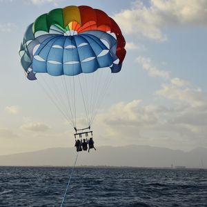 50代の母親と参加しました。数日前にパラセイリングをした妹夫婦からは、「すごく船酔いするから気をつけて!」と言われていたのですが、私たちの船は比較的穏やかな運転だったのか、船酔いの心配はありませんでした。空中では多少揺れましたが、怖さは全くなく、空を飛んでいるようでした。手に防水インスタントカメラを持って空を飛びましたが、撮影には何の支障もありませんでした。