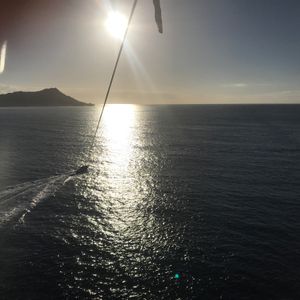風に恵まれほぼ無風状態で出航 4組10人のクルーズです パラセーリングの場所まで10分ほど 到着するとすぐに簡単なオリエンテーションとハーネス合わせ あれよあれよという間に1組目がフライト するすると青空の中に吸い込まれていきます 4組中ラストの私たち 150メートルコースなのでかなりの高さまで上がりました 海の上から見るワイキキのホテル群 青空に映えるダイヤモンドヘッド いやぁ楽しかったぁ!