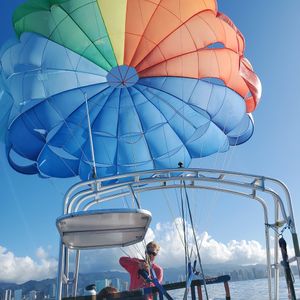 I tried parasailing for the first time in Hawaii. It was so much fun flying over the beautiful ocean. However, I think it's essential for those who are prone to seasickness to take motion sickness medication.