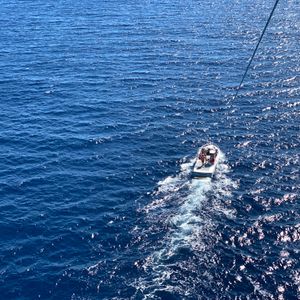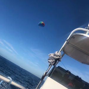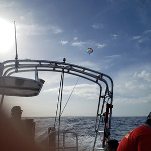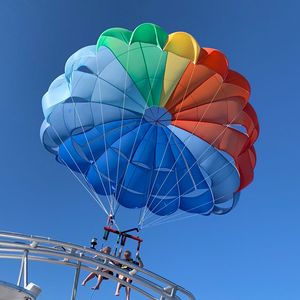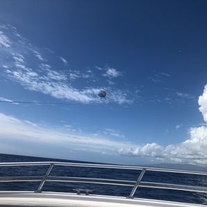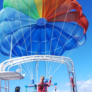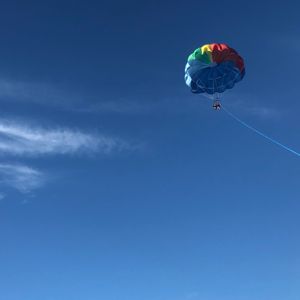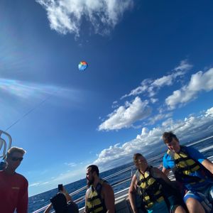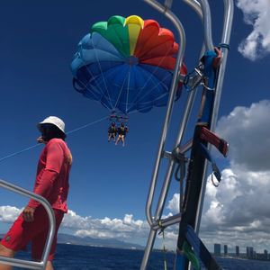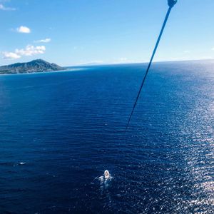 The boat departs from the marina near the Prince, past the Hilton. There were five groups together. Once the boat went offshore, the parasailing opened up with a whoosh! The rainbow-colored parachute stood out beautifully against the sky, and it was so cute. Our excitement skyrocketed. After putting on life jackets and equipment, we took off in order. We were the second group. We quickly ascended to 150m, and the view was unlike anything we had ever seen! We could see the mountains of Hawaii, the outline of the island, and our parachute's shadow on the ocean, which felt absolutely wonderful. Initially, I was worried about the fear of heights, but it was so high (laughs) that I wasn't scared at all. Up there, it was stable with no swaying or wind. Both my son and I kept exclaiming how great it felt! The scenery was amazing! After about 10 minutes, the descent began, but I wasn't scared at all during this time either. The moment we landed, my son kept saying he wanted to do it again! He was laughed at by the others who were with us. The total time, including the round trip, was about an hour and a half. It was on time as stated on the website, and we were able to use the rest of the morning meaningfully after returning to the hotel. The crew was attentive, making sure everyone didn’t get seasick with high-fives, encouragement, pranks, and jokes. My son and I thoroughly enjoyed it. We will definitely repeat this. For families with children, I recommend the early morning sessions when they aren't too tired.