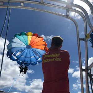 パラセーリングをする場所まで小型の船で移動しました。その間も陽気なインストラクターの方が盛り上げてくれたり音楽を流してくれたりでとても楽しかったです!真っ青な海の上をしばらく移動した後に飛んだのですが、空から見るオアフ島は本当に絶景で、ここでしか見られない貴重な景色でした。大体1組5分程度で、私たちが参加した時には他に4組の方々がいらっしゃったので少し待ち時間はありました。待っている間もずっと船が動いているので、酔いやすい方は酔い止めがあった方がいいかもしれません。最後にインストラクターの方がカメラで撮ってくれた写真をSDで購入できたのも良かったです(別途30ドルかかりましたが購入しました)またハワイを訪れた際には是非ここでお願いしたいです。