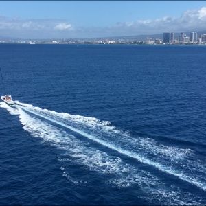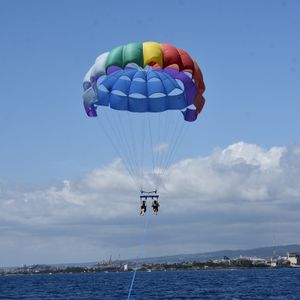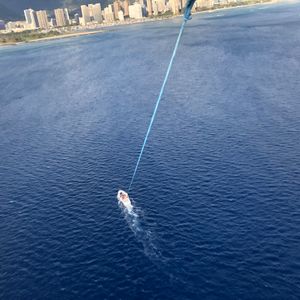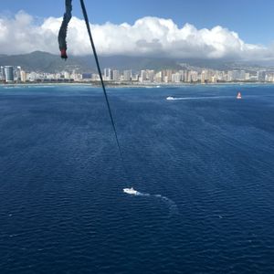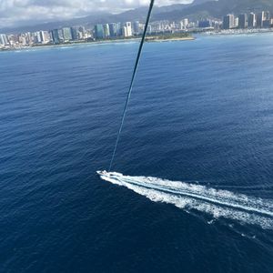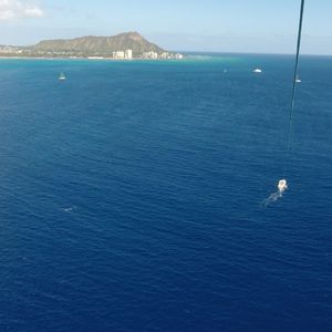 10歳の娘と2人で150mのパラセーリングに挑戦しました。飛んでいるヘリコプターと変わらないくらいに高かったです!風で揺れることはほとんどなく、ボートに乗っているよりも安定した状態です。娘は高いところも大丈夫なので、片手を離したり足を動かしたり余裕がありました。景色はもちろん最高です!ワイキキ、ダイヤモンドヘッド、ワイアナエの方までしっかり見えます。
