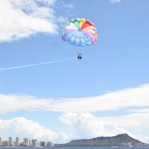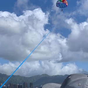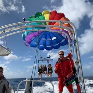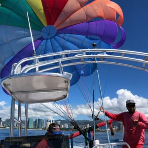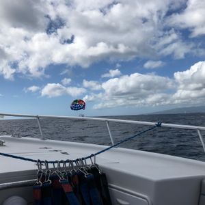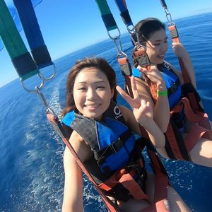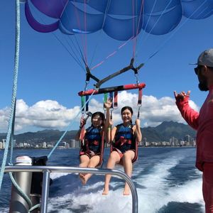 Parasailing over the ocean was amazing. The tour guides were cheerful and kind, which was great. Although it was 120 meters, I was satisfied that I was able to go up high. I only fell into the water with my lower body, so my face didn't get splashed, which was nice. I was able to enjoy a panoramic view of the Hawaiian scenery, and it became a wonderful memory.