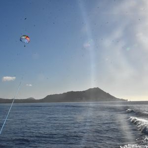 I participated in this as one of the activities for my honeymoon! I was worried because the weather forecast predicted rain, but on the day of the event, it was beautifully clear, and the view from above was amazing!! I did feel a bit seasick on the boat after the parasailing experience, which was a little tough, but since the boat was moving relatively fast, the wind felt nice, and I managed to endure it while others were experiencing the activity! I also purchased the photos they took, and there were some great shots of the surrounding scenery! I think it's best to keep your luggage to a minimum and wear something over your swimsuit.