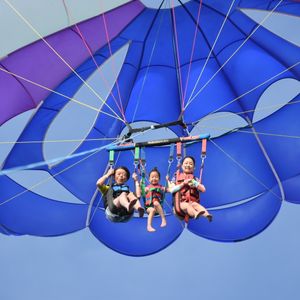 The meeting point expression is unclear as "near the parking lot." It would be better to indicate "here" since there is a small hill in the harbor. Parasailing was fun. It was quiet up in the sky, and the view was amazing. Please be careful of seasickness; my kids were down for the count in the second half. The staff was also entertaining and great.