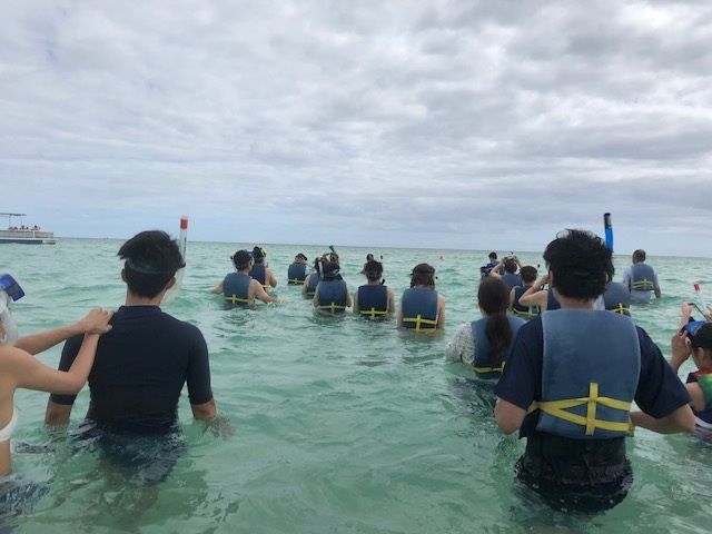 First, we stopped the boat at a spot where turtles are known to appear for some watching. Although they didn't come right in front of us, we did see quite a few turtles. Everyone was excited and taking photos. Next, we headed to the sandbar. As I mentioned earlier, there were many clouds, so it felt a bit chilly when we arrived at the sandbar! I was disappointed because I had relied on the information for the morning session, but the tide was not very low, only about waist-deep. The water level was lower than expected, around ankle-deep, and without any sunshine, it felt cold and a bit murky. Because of this, the snorkeling experience was less enjoyable.