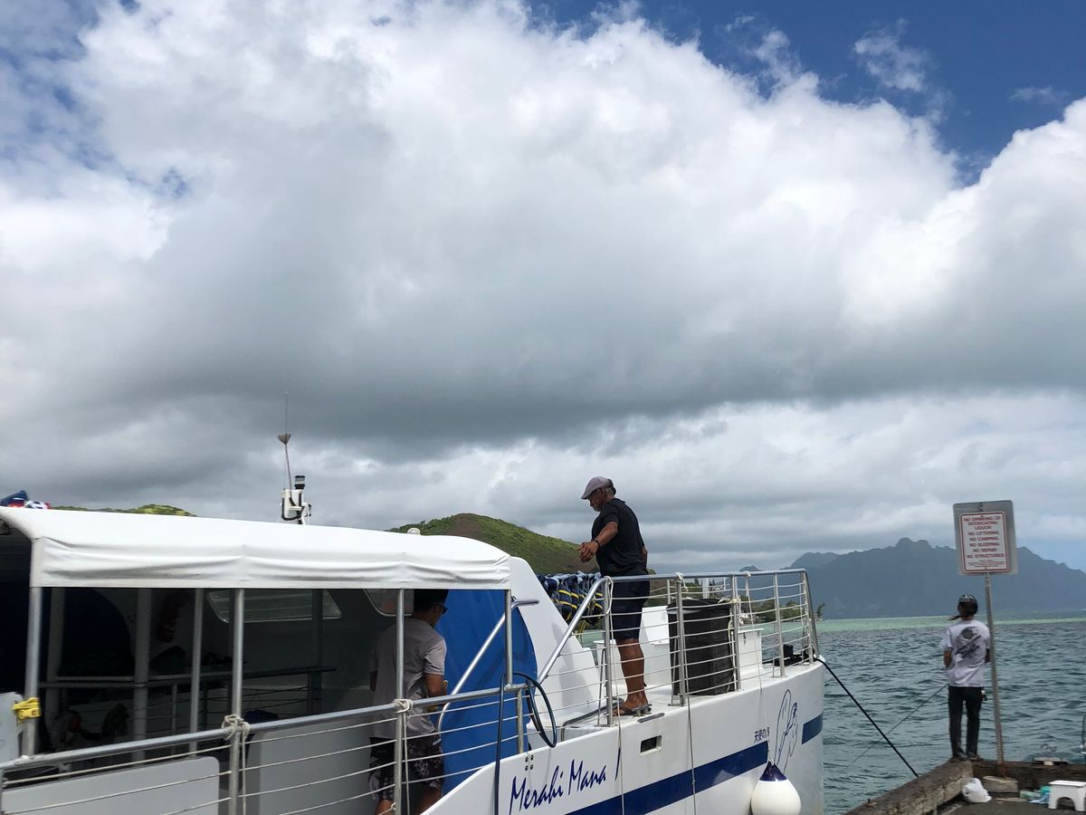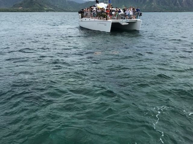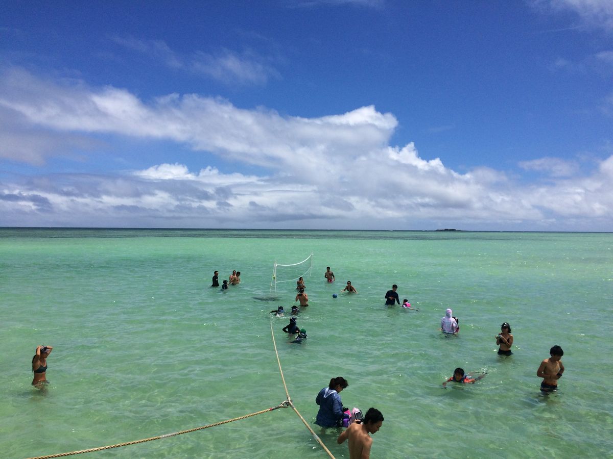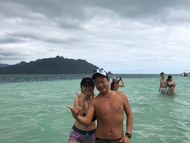 私自身、初めてのハワイで家族をつれての旅行でした。天国の海、期待して前もって潮の時間も確認してこの日にして正解でした。完全には中洲みたいな砂浜がでている状態ではありませんでしたが、膝下くらいで綺麗な砂が海面に反射してまさしく日本にはにない綺麗な海でした。子供たちも感動しておりましたが、ココでの時間は写真撮影か、バレーしかありませんでした。バレーボールはハイテンションな外人さんに占領され日本人ボートチームはただソレを見ているだけでした。ココでもっと過ごすに楽しめる物を催してくれたら、差別化がもっと出来るし、思い出も、感動も倍増するのでは・・と感じました。ゴムボート、トランポリン、水球、水鉄砲、エトセトラ・・・