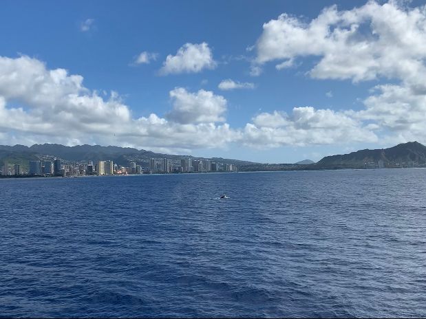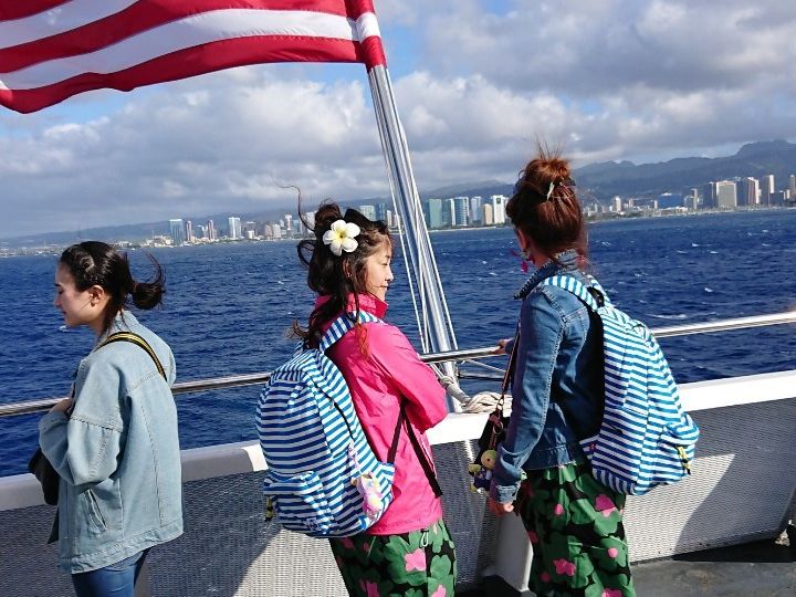 大きな船に乗ってホノルルの沖合へ。