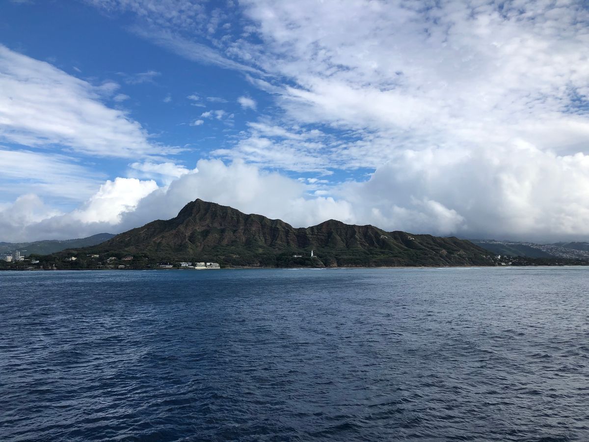 ハワイは夏休みに行くことが多く、今回はじめて1月に行くことになったので、冬のくじらに会いたいとホエールウォッチングクルーズに参加しました。この日は曇り空で風も強く、波が高かったせいかなかなか鯨が出てきてくれず、キャプテンから今日はUターンするとのアナウンスがあり船は引き返すことに。