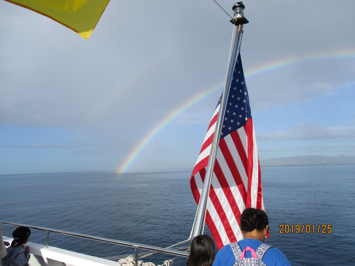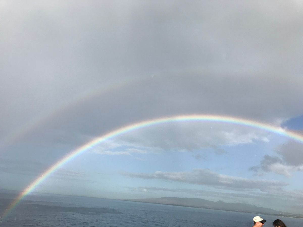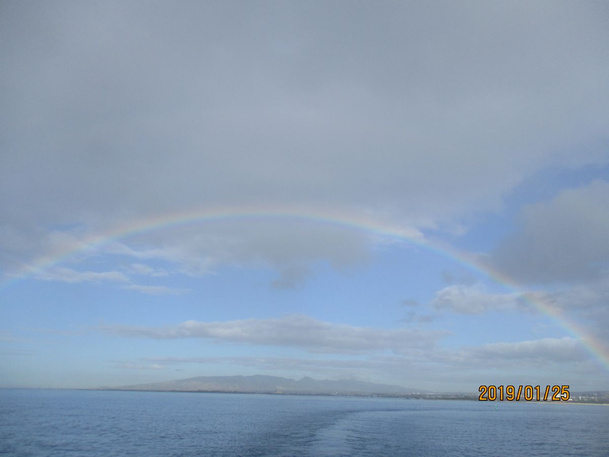 船が港を出港した後に10分くらい小雨が降り、屋上デッキから3階へ避難した後に屋上に戻ってくると、太陽と反対側海上180度に渡り虹が姿を現しました。海上なので虹を遮るものが無く、水面から反対の水面まで七色にすばらしい光景を見せてくれました。