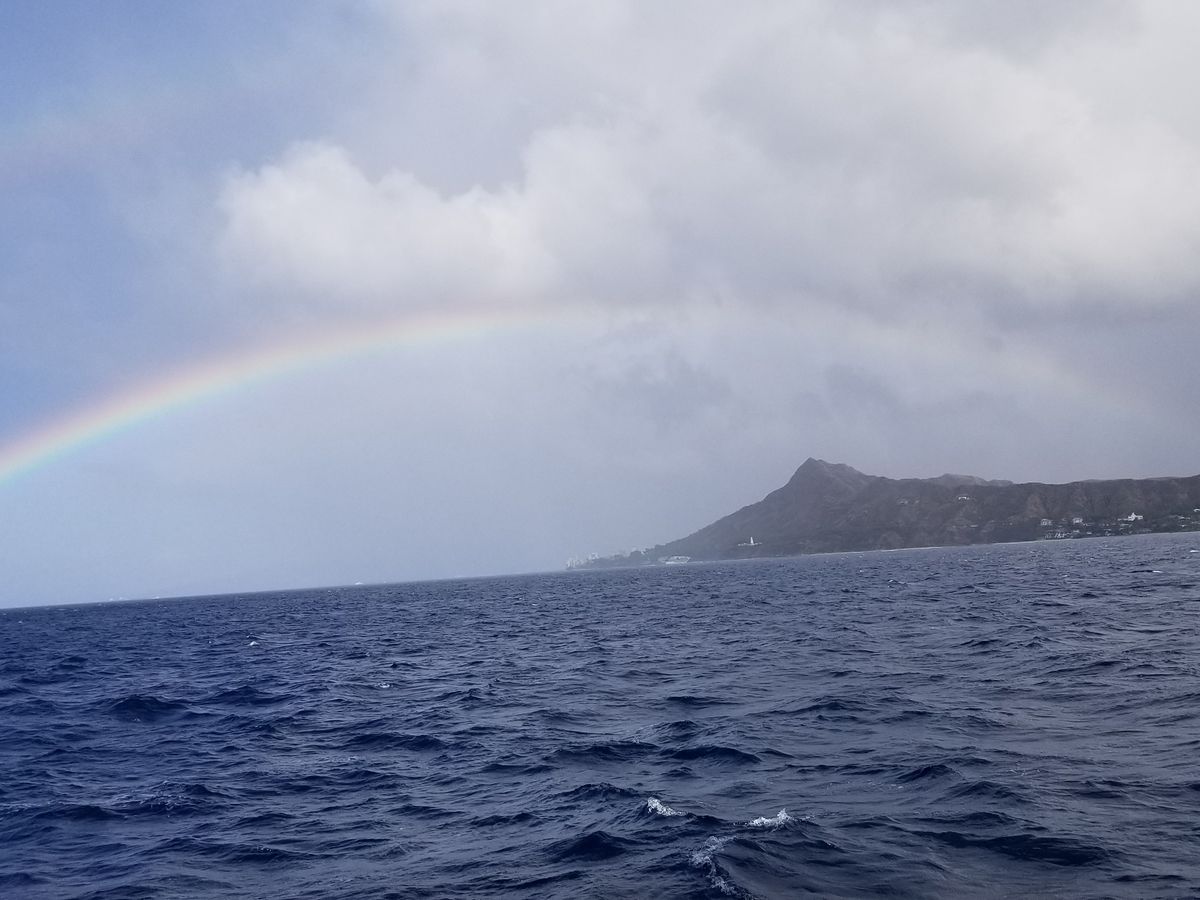 過去の体験談を見ていたら、くじらを見れないことも多いのかなと少し心配しならがら参加しました。実際途中まで全く気配を感じることもできませんでしたが、最後の最後に2頭のくじらの潮吹き(呼吸)や尾びれを見ることができました。うれしかったです。また海上から見るオアフ島はとてもきれいで素敵な写真を撮ることができました。くじらの写真もとりあえず撮ることができましたが、やはり距離があるので迫力ある写真がほしければ、望遠タイプのカメラを準備するか船の専属カメラマンの写真を購入するのが良さそうです。