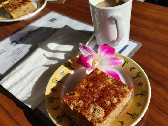風が強く波が高かったせいか、残念ながらクジラは見れませんでしたが、船はほとんど揺れずにパイナップルバナナケーキとコーヒーを美味しく頂きました。