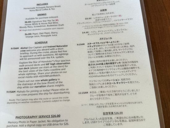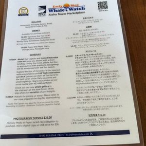 I boarded the Star of Honolulu and participated in a whale watch. Unfortunately, we didn't see any whales that day. We gathered at 8:45, but we left the hotel early and took an Uber because my wife doesn't like getting seasick, so we chose the Star of Honolulu.