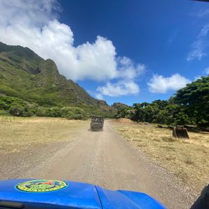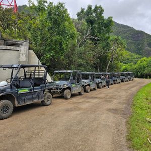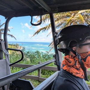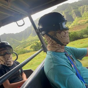 I did a lot of research before experiencing this, and it was just so much fun! It said sandals were not allowed, so I went out of my way to get sneakers on-site, but there were some people in sandals. It was recommended to have a mask or bandana, and I received a bandana with the name of Kualoa Ranch on it! Everyone was provided with helmets and goggles to wear. Since it really is a two-hour ride, make sure to use the restroom beforehand. It mentioned that children from 5 years old can ride, but I think you can have them sit in the middle of the second row with a secure seatbelt and hold them during the ride. However, since you can't go to the restroom and can't turn back, it's better to think carefully about it. At one point, it started to rain, which made it even more enjoyable, splashing through puddles and speeding down steep hills. An elderly couple couldn't keep up, and the staff had to switch drivers.