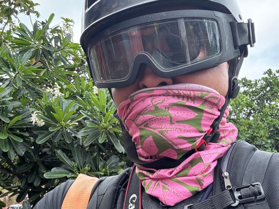 ヘルメットとゴーグル、鼻と口元を隠せるネックウォーマーの形の布を渡され、適宜使用しました。