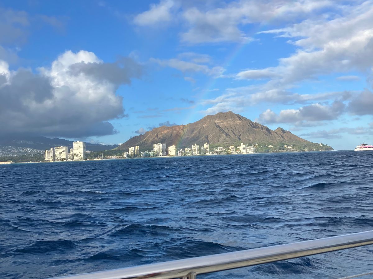 初めて参加しましたが、とてもいい体験でした。船はあまり揺れることがなかったのですが時折強い波に当たると水しぶきが飛んできますがそれも楽しい体験です。ほとんどの人がマイタイを美味しそうに飲んでいましたが、私たちはお酒に弱いのでソフトドリンクにしました。途中ダイヤモンドヘッドに虹がかかり、すてきな景色も見ることができて良い思い出となりました。