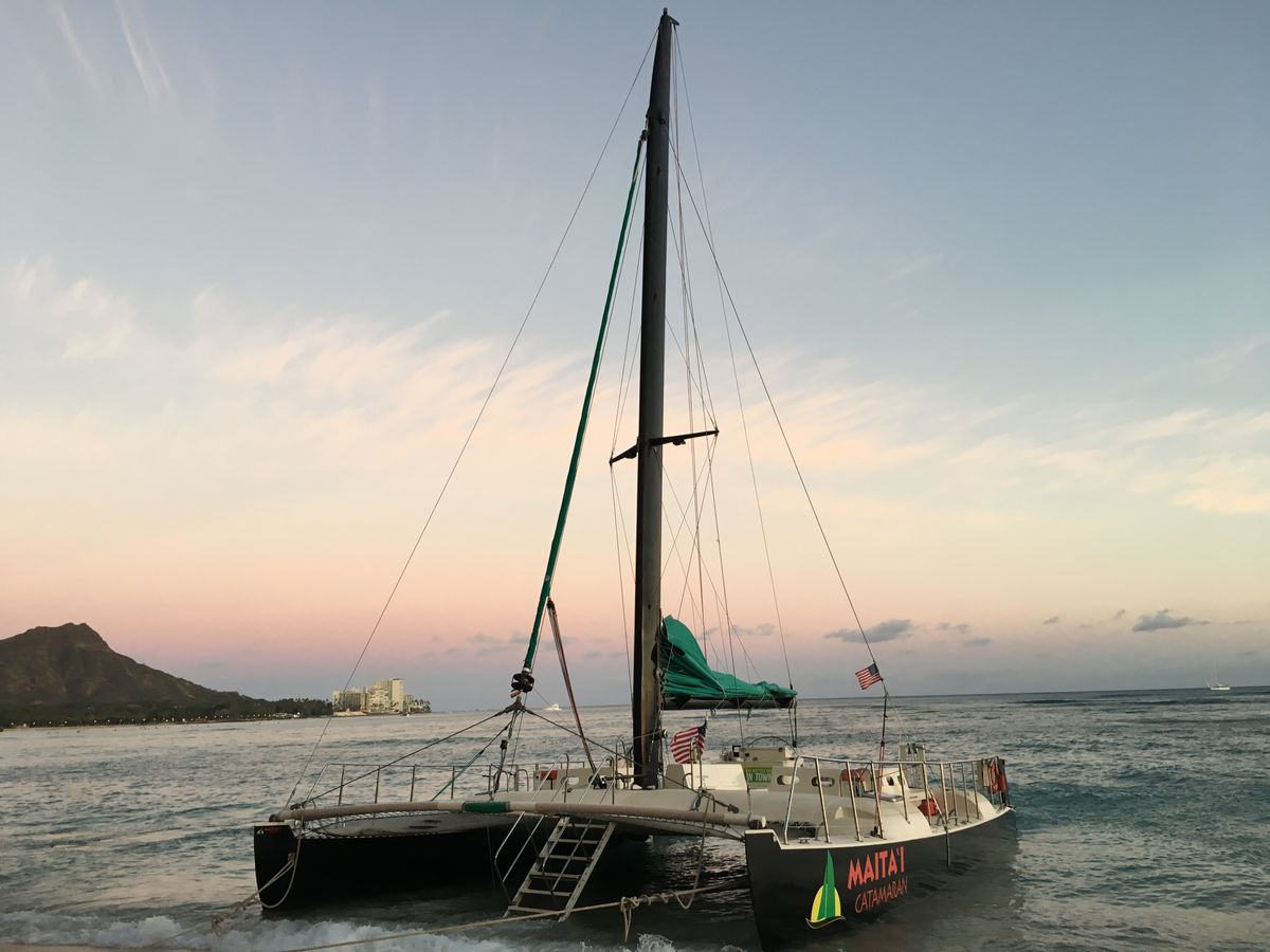 The pleasant sea breeze of Hawaii, the shimmering Diamond Head at sunset, and a cruise while sipping on the original Mai Tai was the perfect way to wrap up our trip. My sister, my daughters, and I participated, and it was everyone's first yacht cruise, but everyone loved it. The original Mai Tai on the Mai Tai Catamaran was as delicious as the crew boasted, and everyone had multiple drinks. About 30% of the participants were Japanese, but everyone was cheerful and having a great time. As the reviews said, the cost performance is very good. For attire, we participated in locally sourced muumuu dresses, but since the wind lifted the hems, I think shorts would be less bothersome. We took off our beach sandals and went barefoot. We didn't get wet on the yacht, but when boarding, the hem of my dress got wet from the waves on the beach. That was fun too. Before boarding, they take group photos with Diamond Head in the background. They take really beautiful photos, so I recommend buying them. I definitely want to participate again on my next trip to Honolulu. The crew, who kept the atmosphere lively, was also great! I am looking forward to joining again!