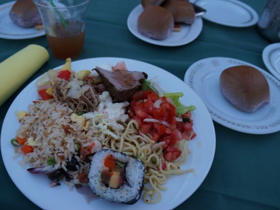 会場に入ると、さっそくレイをかけてもらえて、雰囲気抜群です!!食事は、順番にバイキングへ案内されます。