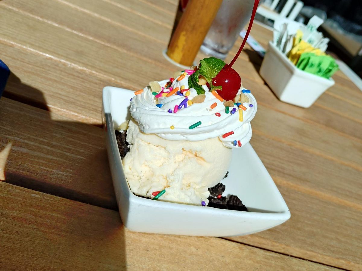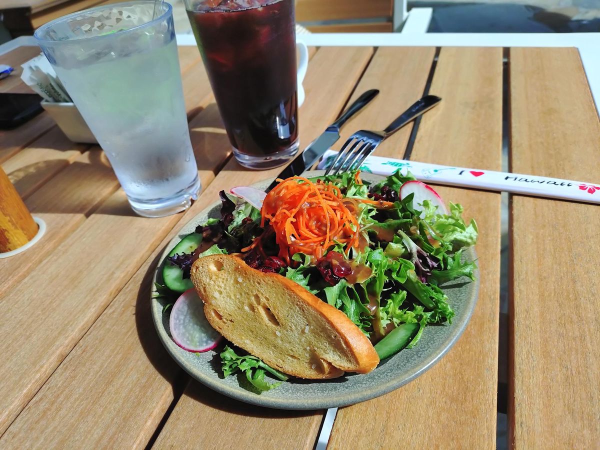 オープンスペースでラフな感じのプールサイドのテラスなので、風も心地よく、寛いで食事が出来ます。サラダの後にメインデッシュが出ますが、3つの中から選べるので、私と友人一人はロコモコを、もう一人の友人はシーフードタコスを選びましたが、どちらもボリュームたっぷり!ロコモコはハンバーグが2枚重なっており、タコスは野菜たっぷりに魚の切り身が挟んであり、いずれも食べ応えがありました。デザートのアイスクリームも美味しかったです。ドリンクもコーヒー、紅茶はアイスかホット、またドラフトビールも選べるので、アルコール好きには嬉しい限りです。
