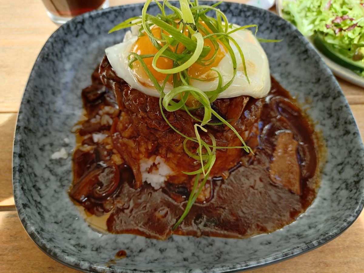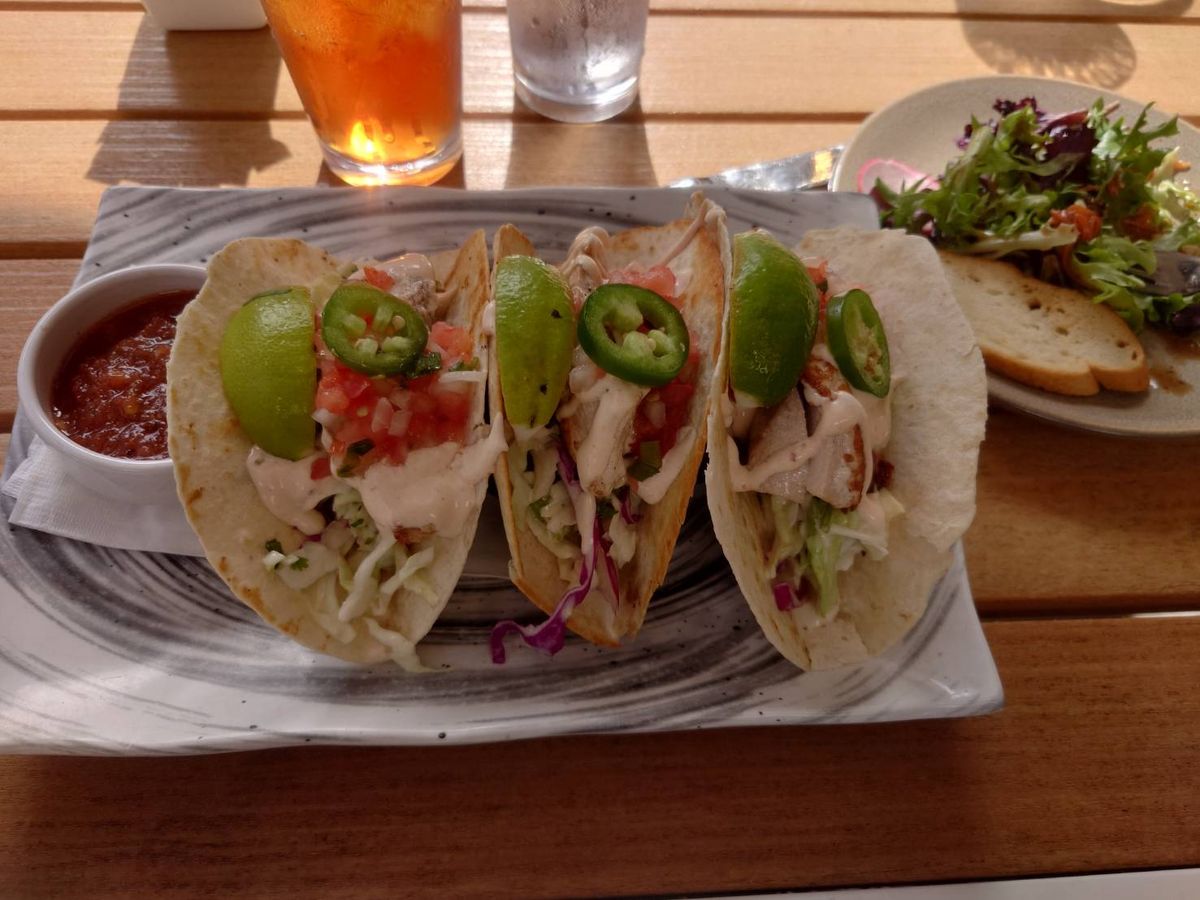 The poolside terrace has a relaxed open space feel, with a pleasant breeze, making it a great place to enjoy a meal. After the salad, the main dish is served, and you can choose from three options. One friend and I chose the loco moco, while another friend opted for the seafood tacos, and both were quite filling! The loco moco had two hamburger patties stacked, and the tacos were packed with plenty of vegetables and fish fillets, making them very satisfying. The dessert ice cream was also delicious. For drinks, you can choose between iced or hot coffee and tea, as well as draft beer, which is great for those who enjoy alcohol. We had a delicious and enjoyable meal.