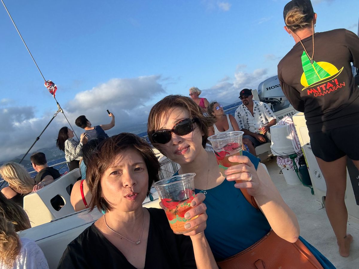 The sunset cruise in Hawaii was beautiful, and the all-you-can-drink option is recommended for those who enjoy alcohol. There were quite a few waves, so we were worried about getting seasick and took motion sickness medication before participating. Thanks to that, we didn't experience any seasickness.