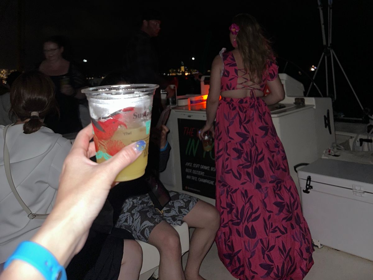 他の船での参加はありましたたが、こちらは初めて。ホテル内にある船会社のカウンターでチェックインを受け免責についてチェックをするなどしっかりした会社という印象。サンセットは復路からようやく始まり、往路とはまた違った印象が味わえます。飲み放題とのことですが、無料のドリンクの味はあまり好みではなく1杯飲みきれず、ビールやシャンパンは別料金です。時々大きな波がくるため船独特の揺れはあります。船酔いで動けなくなった方がいたので本当に弱い方は酔い止めがあったほうが良いと思います。とにかく90分、何もしない贅沢な時間を味わいたい方におすすめです。