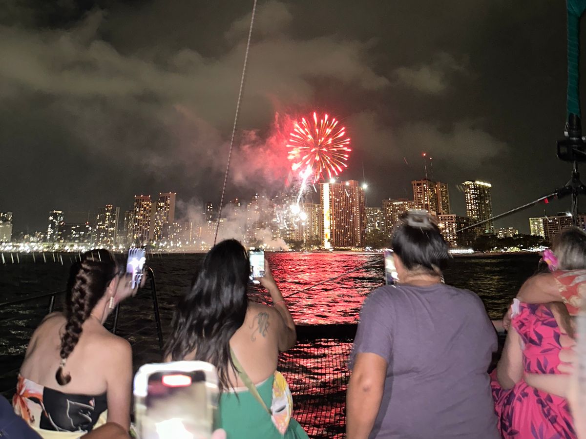 During the fireworks, cheerful music played, and everyone was excited, cheering loudly. After that, the boat slowly made its way towards Diamond Head, and the gentle night breeze felt pleasant on my skin. The dark silhouette of Diamond Head was overwhelmingly impressive, and the sparkling cityscape of Waikiki in the distance was beautiful. I was able to relax completely, filled with a sense of liberation.
