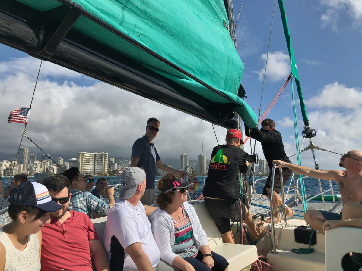 This is my second time using this service this year. I was able to see a wonderful sunset, and the sea breeze was refreshing. The atmosphere on the boat was great, and the Mai Tais and beer were delicious. They even gave us snacks as a gift on the way back. I plan to ride again when I go to Hawaii.