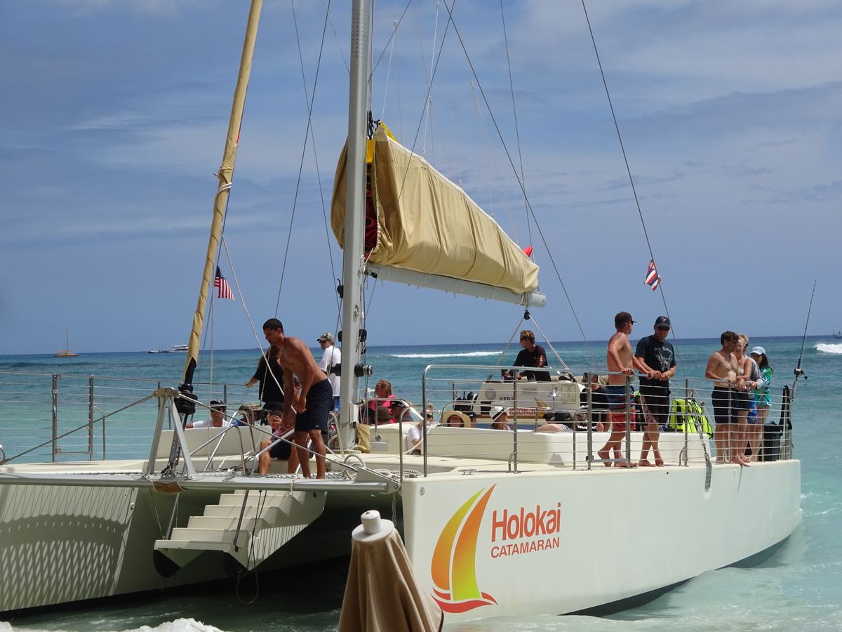受付場所は事前に調べていたのですぐにわかりました。集合時間14:30に到着し50分に戻って来てと言われたのですぐ前で待っていましたが、15:00になっても予約客が来ないのか名簿を見ながら何やら話してなかなか乗船出来ませんでした、結局私達と3人家族だけで出航しました。貸切状態でゆったりできワイキキビーチを沖から見ているでは良かったけれど、延々沖(ダイヤモンドヘッドの方)へ出た時ちょっと怖かったかな。イルカとか何か見れたらもう少し楽しめたかもですがちょっと退屈してきました。英語が話せないのでスタッフは大丈夫?と日本語で気遣ってくれました。