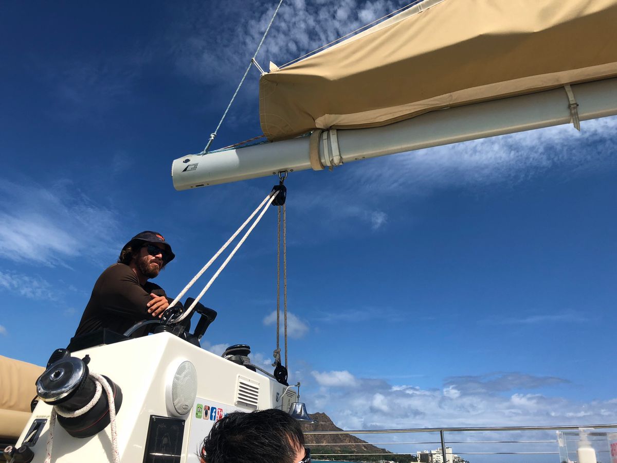 I quickly found the reception area since I had researched it in advance. I arrived at the meeting time of 2:30 PM and was told to return by 3:00 PM, so I waited right in front. However, even at 3:00 PM, it seemed like the reserved guests hadn't arrived, and they were discussing something while looking at the list, which delayed our boarding. In the end, it was just our group and a family of three that set sail. It was nice to have the boat to ourselves and enjoy the view of Waikiki Beach from the ocean, but when we went further out towards Diamond Head, it was a bit scary. If we could have seen dolphins or something, it might have been more enjoyable, but I started to feel a bit bored. Since I can't speak English, the staff kindly checked on me in Japanese to see if I was okay.