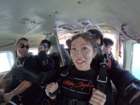 With an instructor, I boarded a Cessna and went diving! The view was just like looking out of the small airplane window, above the clouds. One by one, we took off, and before I knew it, it was my turn! I felt no sense of reality about diving because we were so high up, and then suddenly, we jumped. We dove straight down, spreading our arms and legs into the diving position. Even while descending rapidly, I had plenty of time to enjoy the scenery. After a while, the parachute opened, and we descended gently. I savored the views over the mountains and the ocean. It's something I wouldn't do in Japan, but I found the courage to dive because it was Hawaii. I was filled with anxiety right up until the moment, but I'm glad I did it.