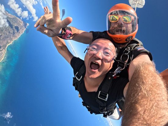 I experienced skydiving for the first time. At 52 years old, it was my first skydiving experience. The moment the door of the Cessna opened against the blue sky of Hawaii, my heart raced intensely. More than fear, I felt a rush of "I am living in this moment." With the instructor's signal, I leaped into the sky—pulled by gravity, the wind hitting my face, the sea and clouds flipping around me. The grandeur was so overwhelming that tears streamed down my cheeks. All the doubts and regrets of my 52 years melted away in the wind. When the parachute opened, I was greeted by the vast land of Hawaii and a rainbow in the silence. My heart cleared, and I simply whispered, "I'm glad to be alive." When I landed on the ground, I realized that in that moment beyond fear, my perspective on life had changed. Having gained the best experience, I will walk into my second life.
