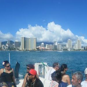 とても暑く集合までの待ちがたいへんでした。日陰で待ちたかったかな?でも、船が出港してからはここちよい風で気持ちがよかったです。沖合で飲むビールのおいしかったこと。満足です。海から見るワイキキのまちもなかなかのものでしたよ。