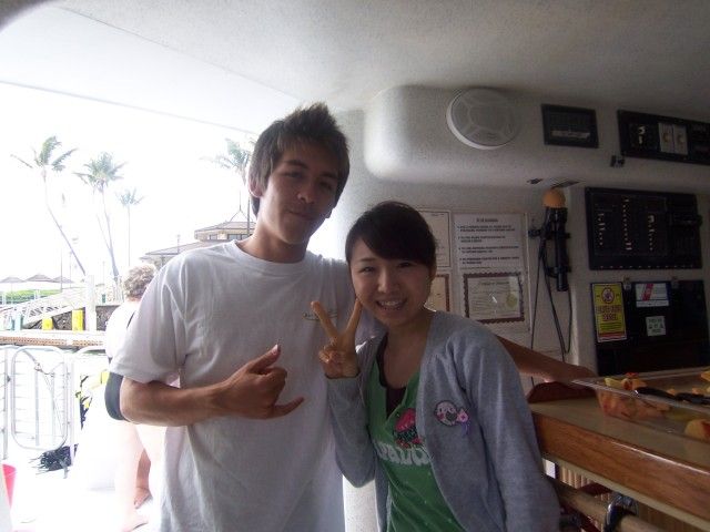 ワイキキから45分でコナマリーナに到着、テレビで見るようなヨットハーバーまるで自分たちがオーナーであるかのようなリッチな気分で船に乗り込み、イケメン風のお兄さんとダンディなボーン船長とキュートでかわいいハワイ娘の3人が案内してくれます。コーヒー・紅茶・水に缶ジュースは飲み放題です。ツアーの案内にイルカとの遭遇は確約ではありませんと書いてあったので、会えなくても仕方ないかぁと思っていたら、10分もしないうちに「イルカ」という声で船首に出てみるとイルカの群れが泳いでいました、親子イルカまでいます、親子仲良く離れずに泳いでいます、船はつかず離れずで進んでいきます、イルカは夜行性で昼間は寝ながら泳いでいると説明を聞きながら見ていると、空中に飛び3回転スピン・2回転スピンをしてくれました、カメラしかもっていなかったので、今から飛ぶぞと言ってくれない為、シャターチャンスは見逃しましたが、ビデオを持っていくといいですよ。さあいよいよシュノーケルに挑戦、説明を受けいざ海へ、息の吸う吐くがうまくいかず、げぼげぼ、こつをつかみ水深6mの海の中をのぞいてみる、海がめのいそうなスポットへハワイ娘が案内してくれます、海がめが泳いでいる、しかも5頭もいるではないですか、そして船から「イルカがきたよ」との合図に海の中をのぞく、すぐ横にイルカが泳いでいる、「ピー」というイルカの声が聞こえる、娘と二人顔を出して、見たの合図、娘はもぐってみたいとハワイ娘におねだり、シュノーケルをはずし、足ひれをはずし空気をぬいて、素もぐり、うまく沈まない、2.3回トライ少し深くもぐって耳が痛いと断念、ハワイ娘は、素もぐりでかなり深く沈んで手本を見せてくれていました。なぜかこの日はシュノーケルをする人が私と娘ともう1人シアトルから来た娘さんと3人だったので、ゆったりと楽しむことができました。他の人たちは船から、私達をウォチングしていました。その後は船のなか、チキン.パン.サラダ.フルーツ.ヨーグルト.マフインの朝食、とってもおいしかったです。次回も絶対シュノーケルをしたいと心に決めた日でした。Alan1ちゃん本当にありがとうございました。とっても有意義に過ごすことができました。