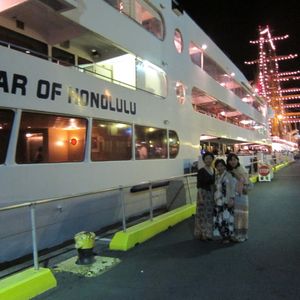 It started with a sunset while enjoying dinner, and I had the main dish of lobster. My hands got a bit messy, but it was delicious. I wish there had been a special spoon for crab so I could have eaten everything. It would have also been nice to have extra napkins. I thought a finger bowl would have been even better. The steak was a reasonable size and very tasty. I reserved a window-side seat, but during the fireworks, everyone gathered on the right side, and only a couple of groups were seated to watch. Luckily, I was able to join one of those groups. I enjoyed the night view of Honolulu and was able to watch the spectacular fireworks while seated, making it the best night ever. The entertainment until we returned to port included Hawaiian and jazz performances, and we all got excited dancing together at the end. The traffic on the way back to the hotel was as expected and took a while, but compared to the traffic in Tokyo, it wasn't too bad. The fare was nearly double what it was on the way there, but I was able to get some great information from the taxi driver during our conversation.