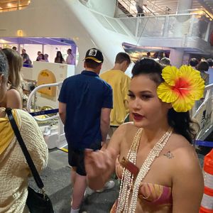 With the Royal Hawaiian Hotel behind us, we enjoyed a hula dance show in a charming square while learning about Hawaii's history. All the guidance was in English from the reception, but the staff were warm and welcoming, making for a very comfortable experience. The staff came to our table to confirm drink orders, and dinner was served buffet-style, allowing us to help ourselves. During the welcome activity, we could freely visit a corner showcasing traditional Hawaiian crafts from our table, taking photos and having fun. People from various countries gathered around their tables, creating an atmosphere reminiscent of an American garden party. The food was delicious, and the show was substantial, making for a truly satisfying experience!