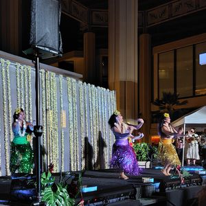 本格的なフラショーを鑑賞したくて調べていたところ、このビュッフェ付きのショーを見つけて予約しました。受付を済ませると、レイを首にかけていただき、そのまま席へ。すぐにビュッフェを堪能、さすがハイアットの料理だけあってどれもとても美味しく頂きました。定期的に行っているショーのようですが、ステージの作りはいささか簡素に見えて、始まるまでは若干の不安を感じましたが、いざ始まるとステージの上で躍動感あふれるダンサーの方たちにすっかり魅了されてしまいました。