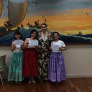 母は日本でのフラ経験3年以上の中級者ですが、妹と私は初体験でした。でも、色違いのパウスカートを身に着けて、講師のするとおりに踊り、1時間で何とか4つのパートを覚え、ところどころ間違いながらも、通して1曲踊れるまでになりました。