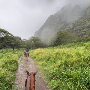 I enjoyed a 2-hour horseback riding tour with a group of about five Japanese people and a female staff member. The staff was very cheerful and provided advice in simple Japanese. Unfortunately, it rained the entire time, so we couldn't see the magnificent scenery very well. I definitely want to experience it again when I visit Oahu.