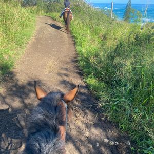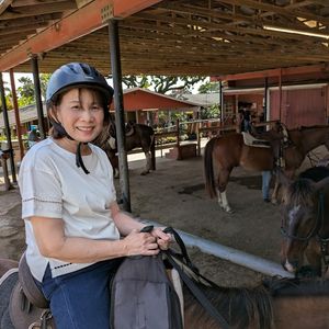 On-site, after filling out a waiver and choosing a helmet and saddlebag, we watched a three-minute Japanese video. Once everyone was ready, we mounted the horses and started. The horses walk slowly, but when climbing hills, they move their legs quite a bit, causing a bit of a jolt. However, as long as you hold the reins firmly, there’s no problem. As we progressed through the forest, we came to a spot where we could see the beautiful blue ocean. The breeze felt nice! After that, we traversed hills nestled between mountains, and I truly felt that the mountains in Hawaii are beautiful. We returned to the starting point in almost exactly two hours, and after getting off the horse, my thighs trembled for a while. The weather was perfect, making it a wonderful experience for my husband and me.