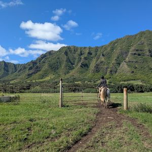 現地では、免責同意書に記入、ヘルメットとサドルバッグ選択の後、3分ほどの日本語VTRを見ました。そして馬にまたがり、全員の準備が出来るとスタートです。馬はゆっくり歩きますが、坂を登る時などは足が大きく動くので、少し大きく揺さぶられます。でもしっかり手綱を持っていれば問題ありません。森を進むと青くて美しい海が見える所に出ます。風が気持ちいい!その後は山に挟まれた丘陵ですが、ハワイは山が本当に綺麗だと感じました。ほぼ2時間きっかりでスタート地点に戻り、馬から降りた後はしばらく太腿がプルプル震えました。天気が最高だったこともあり、私たち夫婦にとって素晴らしい体験でした。