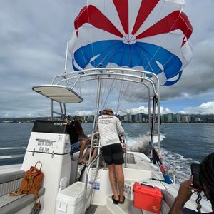 We boarded the boat with three groups and enjoyed cruising while gazing at the clear waters of Hawaii. After savoring a peaceful time, it was finally time for parasailing!