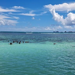 The boat was large, so it didn't sway at all, and we enjoyed drinks, donuts, and live music on board. I had signed up for a tour that was supposed to coincide with low tide, but we couldn't see the sandy beach, and the water depth was about to the chest of an adult. However, with this depth, it's safe even if you fall while snorkeling, and it might be just right for enjoying snorkeling. During snorkeling, you get to feed the fish, so they come right up to you, which is fun!