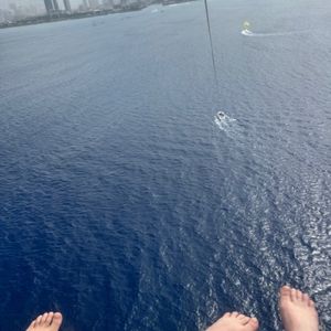 First parasailing experience. We participated as a parent-child duo with no understanding of English at all. The staff at the reception had some knowledge of Japanese, but the two boat staff only spoke English. There were five groups in total (two groups were foreigners, and three groups were Japanese) that set off together. We took turns flying in the order determined by the staff. At one point, one person got seasick and had to go overboard, so I think those prone to motion sickness should take precautions. When parasailing, it was okay to wear sunglasses and have a smartphone hanging around your neck (at your own risk). When landing, they lifted us up a bit again just as our feet touched the water, and ultimately, we were lowered onto the boat, so we hardly got wet. I couldn't understand the staff's instructions (in English) at all, but I could feel the fun atmosphere, and I really enjoyed it! The whole experience from check-in to disbanding took about an hour and a half, and considering the location near Hilton, I think it's an easily accessible activity to try.