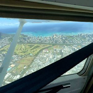 A Japanese person explained the instruments and piloting in Japanese, which was reassuring. Depending on the weather that day, they created a flight plan, and after taking off from Honolulu Airport, we headed north, went west, and returned to Waikiki before landing back at Honolulu Airport.