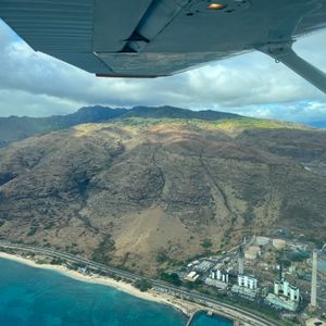 The actual flight course was from Honolulu Airport, around the coast to the east, to Dillingham Airfield, where we landed once to switch pilots, then over the Dole Plantation, making a U-turn over the airfield and back around the coast to the west, returning to Honolulu Airport. It was so much fun to circle Oahu from the sky. We experienced thrilling moments with steep descents and sharp turns under the instructor's control. The instructor spoke English, but the flying wasn't too difficult, so it's not a problem if you don't understand English very well.
